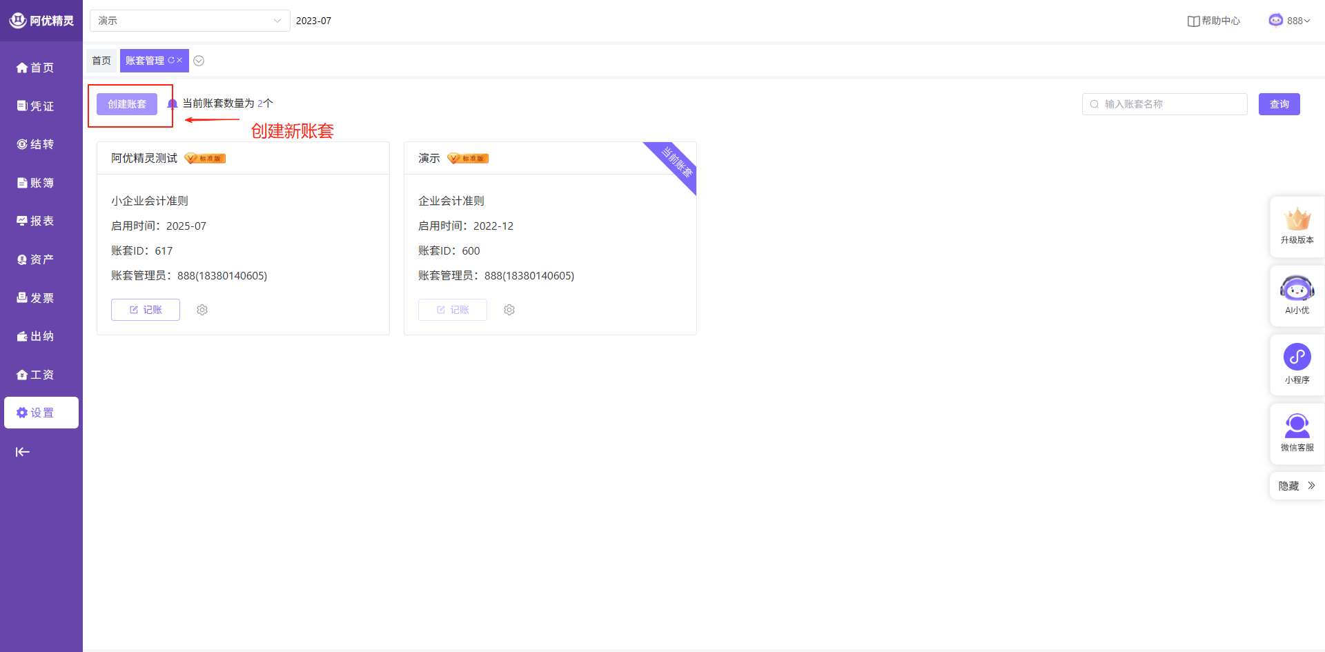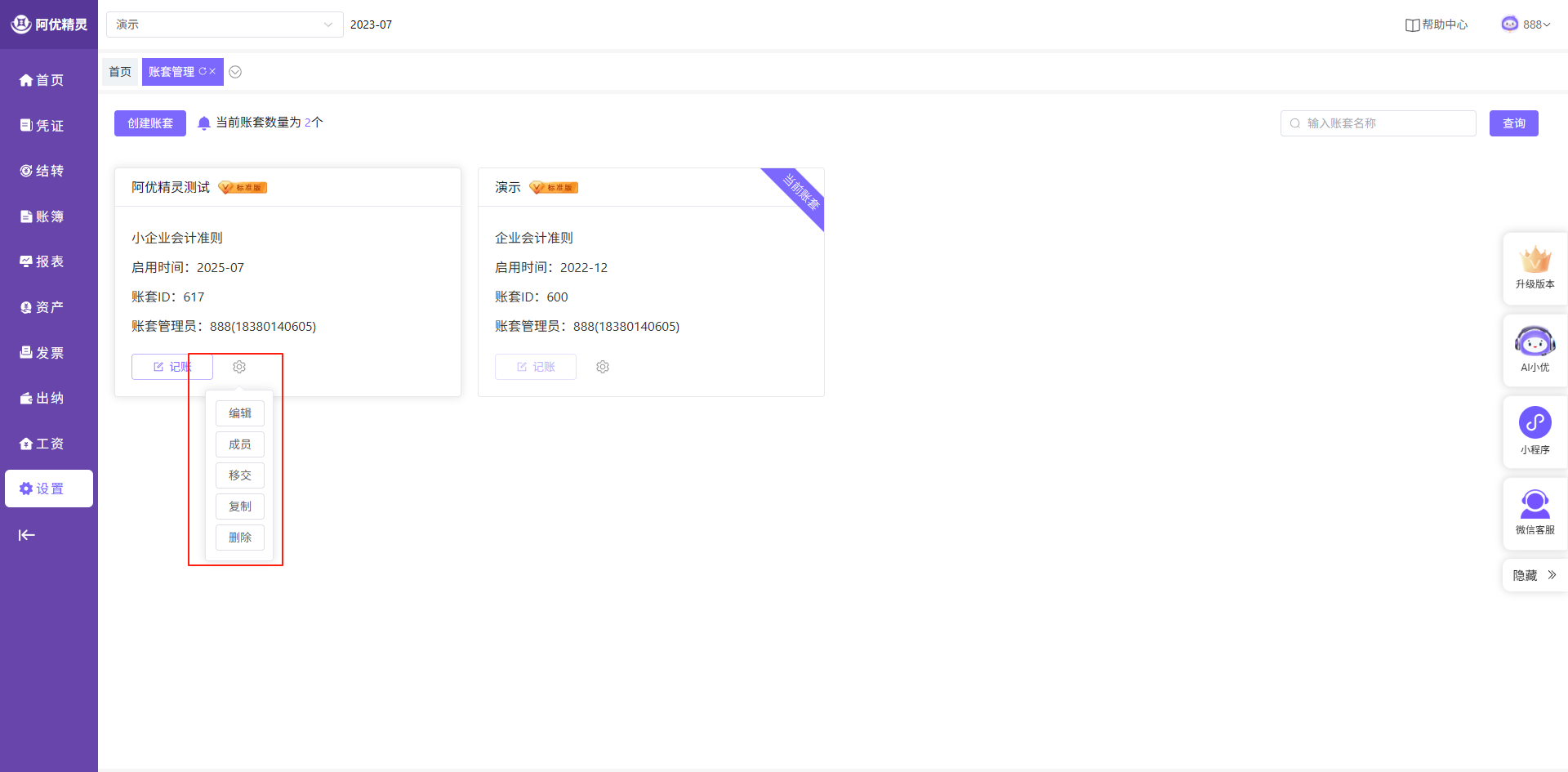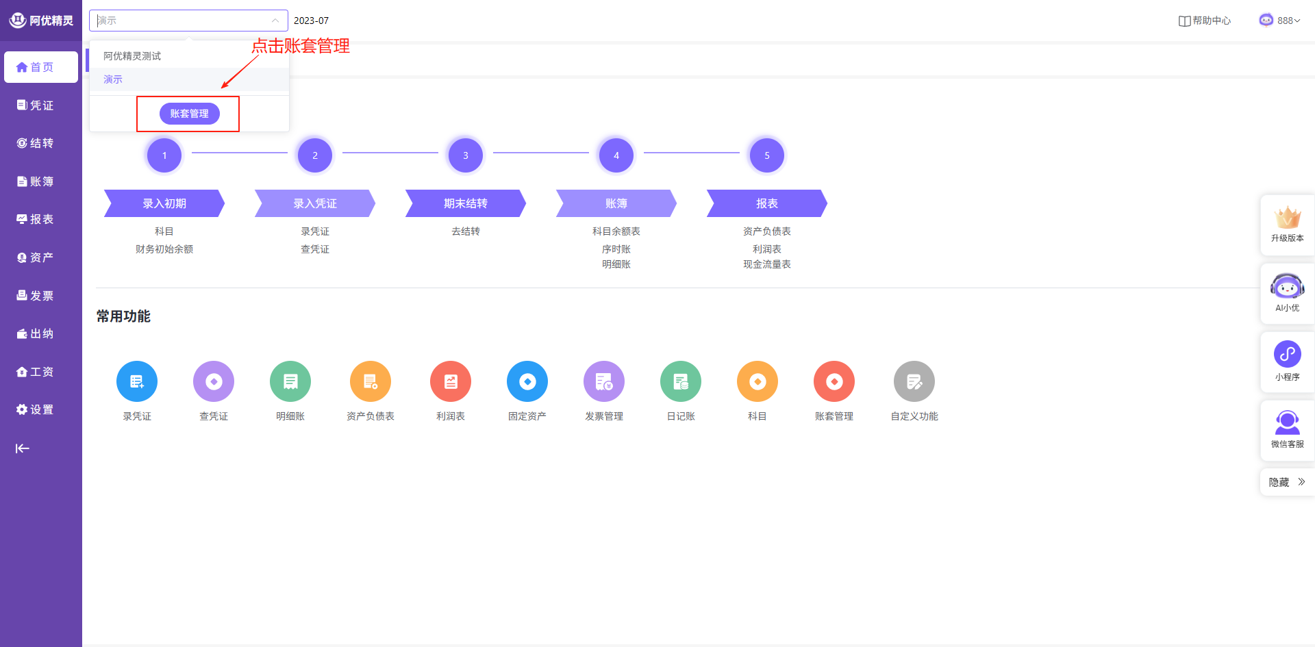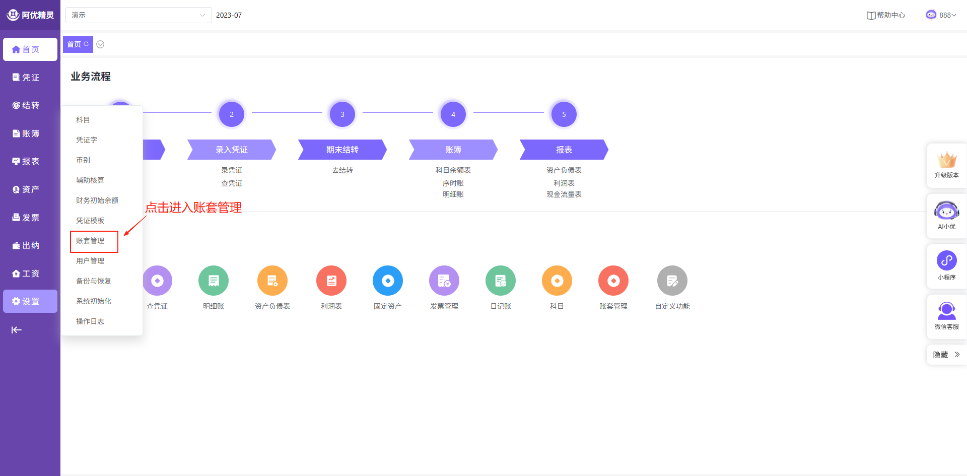 账套管理可以通过左上角或设置按钮进入