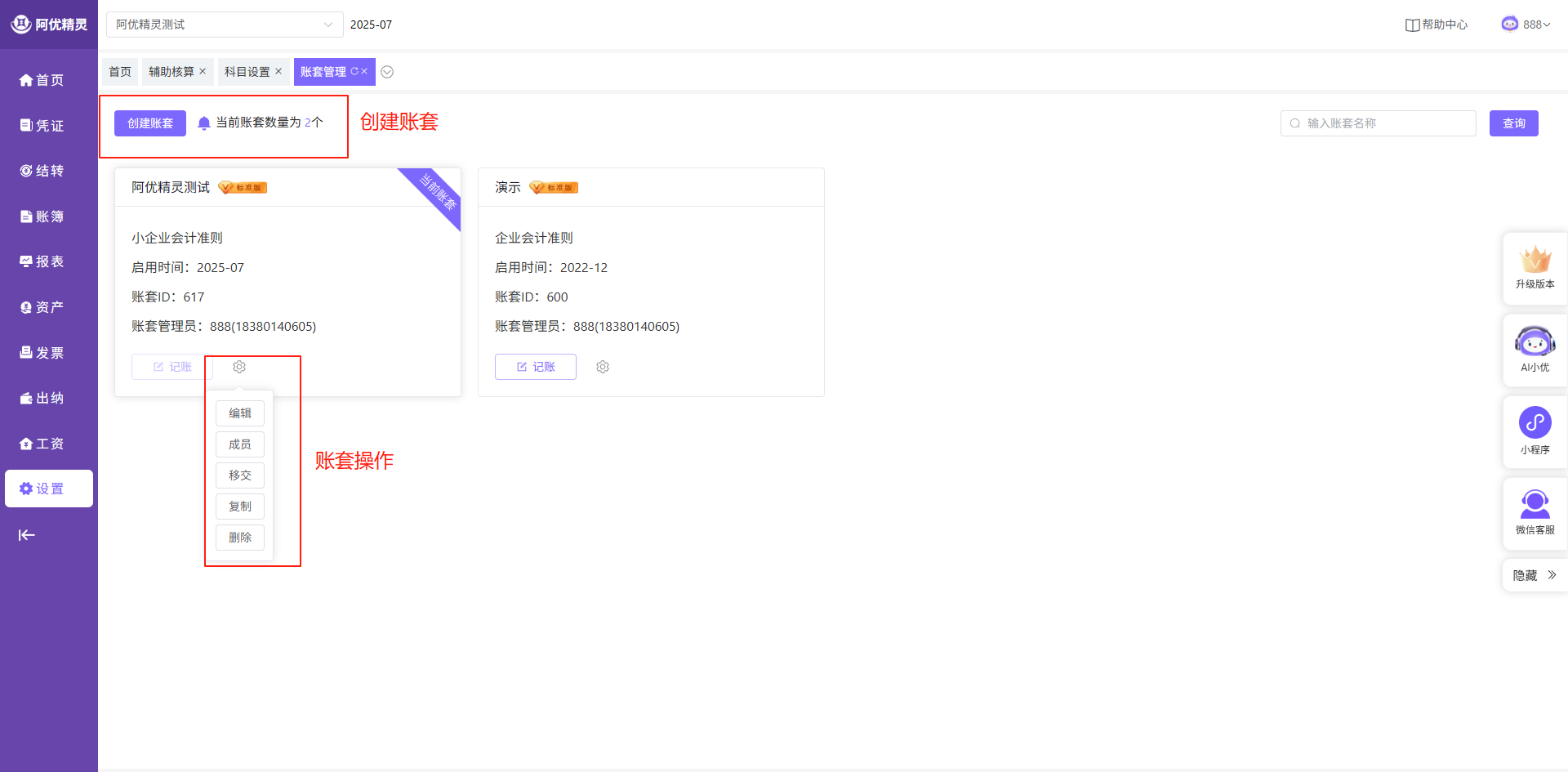 在该功能模块中,可以管理不同账套,为不同的业务场景或者核算需求,搭建独立又清晰的账务体系;权限分配也能精准实现 —— 既能授权子账号操作特定的账套,使每个账号明确自身职责,规范操作,保障使用安全。