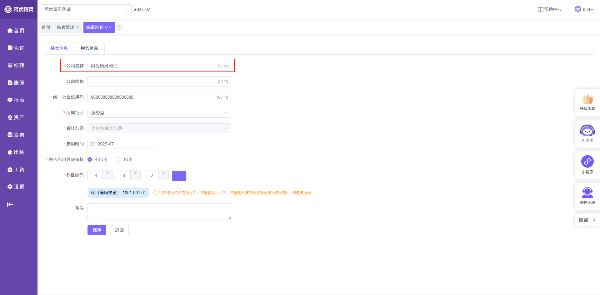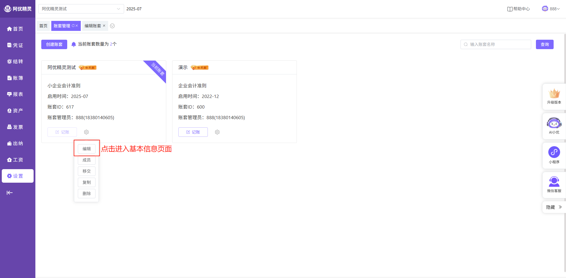 若您在阿优精灵软件做账时发现公司名称错误,可以进入账套管理页面,点击对应账套的“