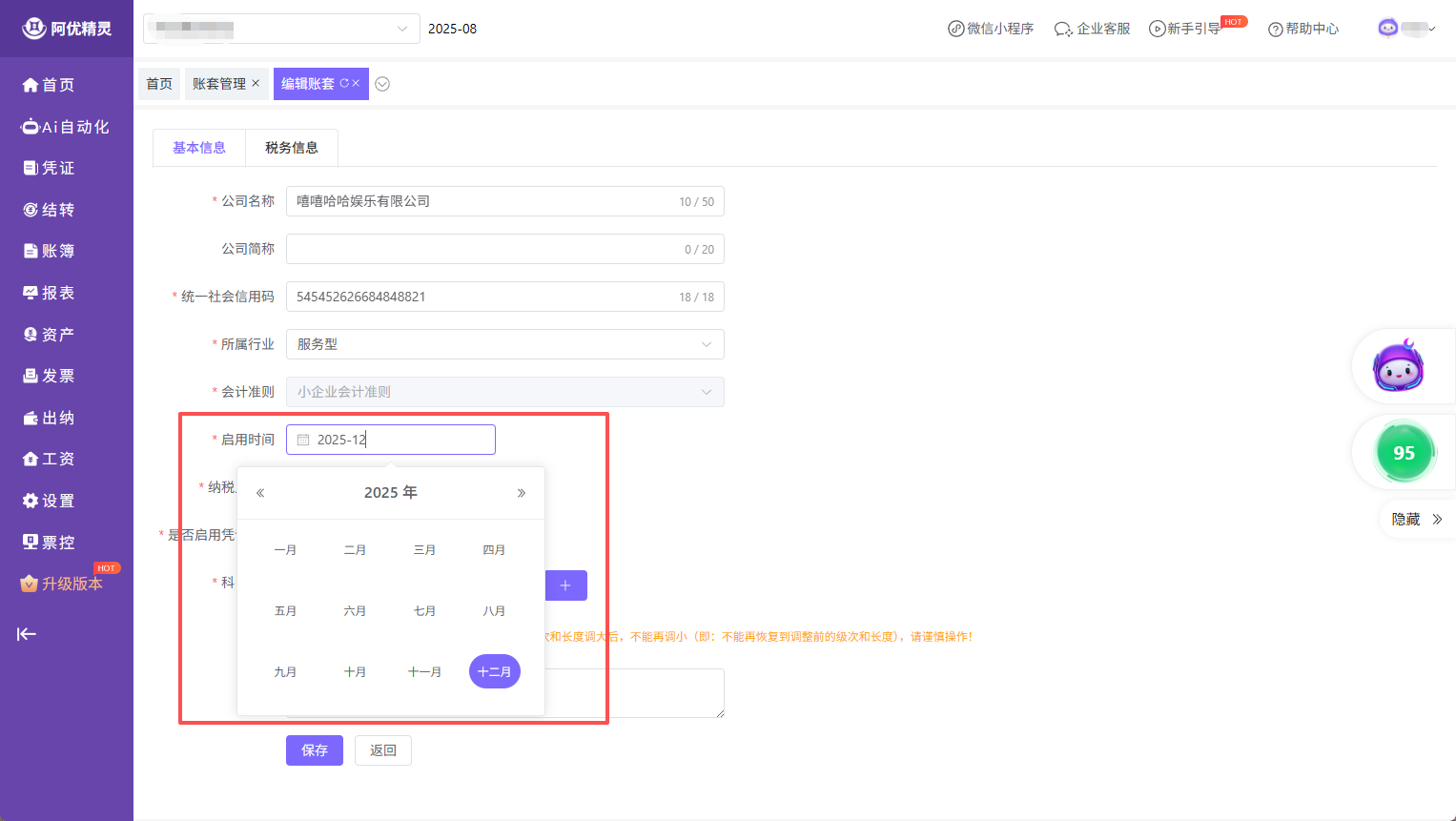 账套启用时间,是指您在阿优精灵系统中正式开始核算业务、录入凭证的起始年月。它是您这套电子账簿的时间起点。