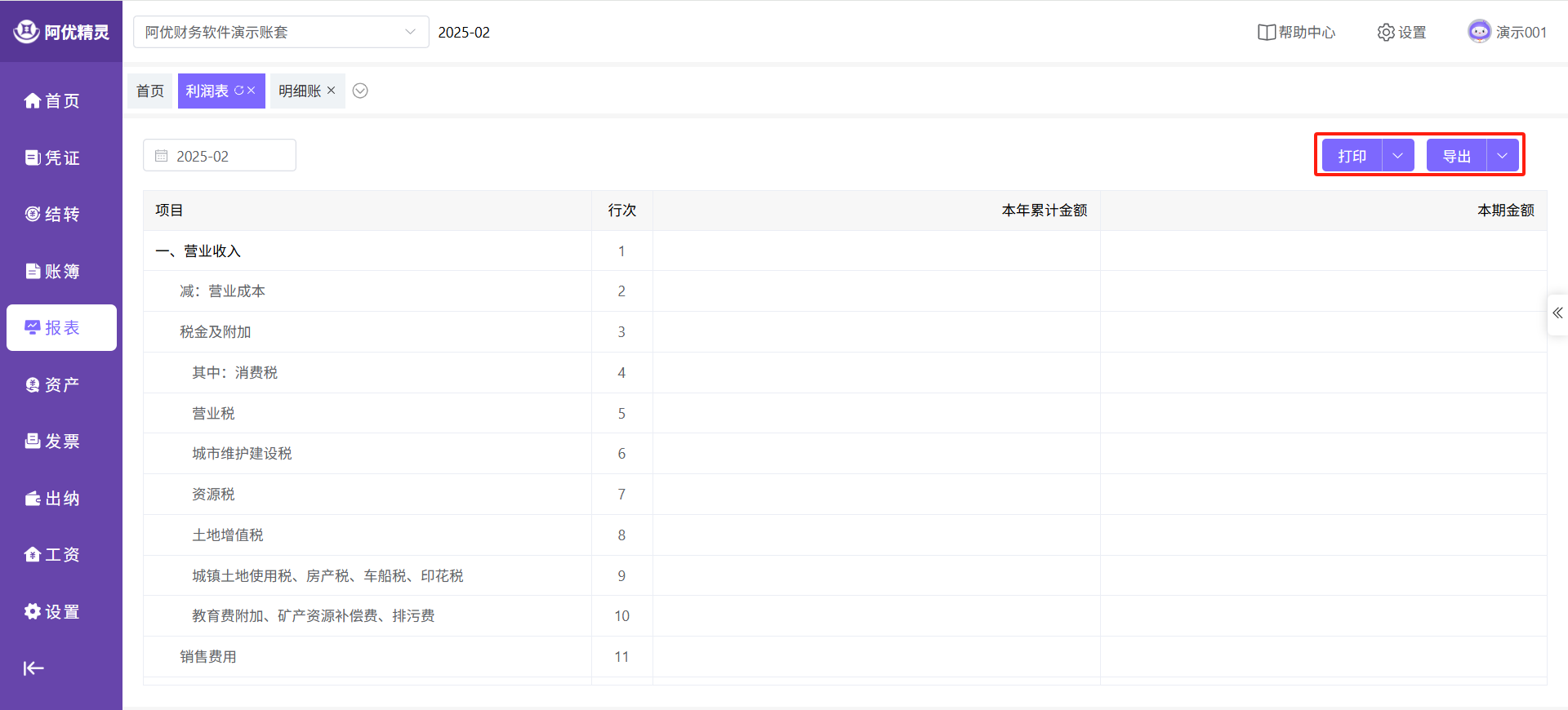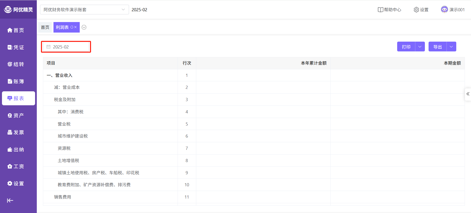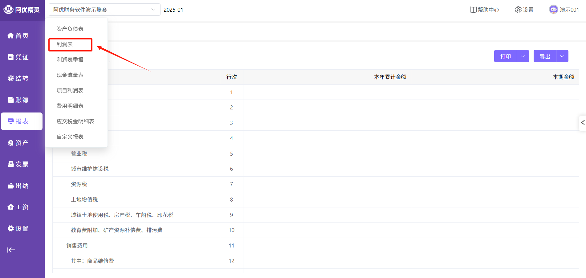 点击【报表】-【利润表】或【首页】-【利润表】进入页面。