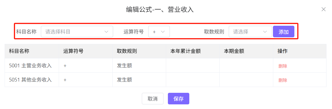 - 编辑公式 选择对应科目、运算符号和取数规则,不需要的可以选择删除公式