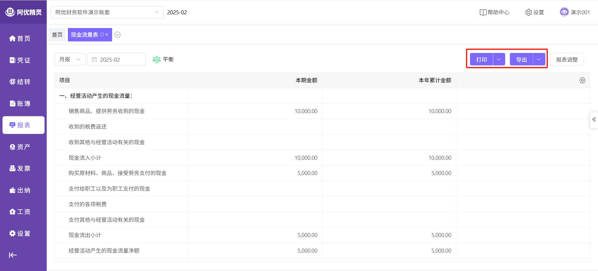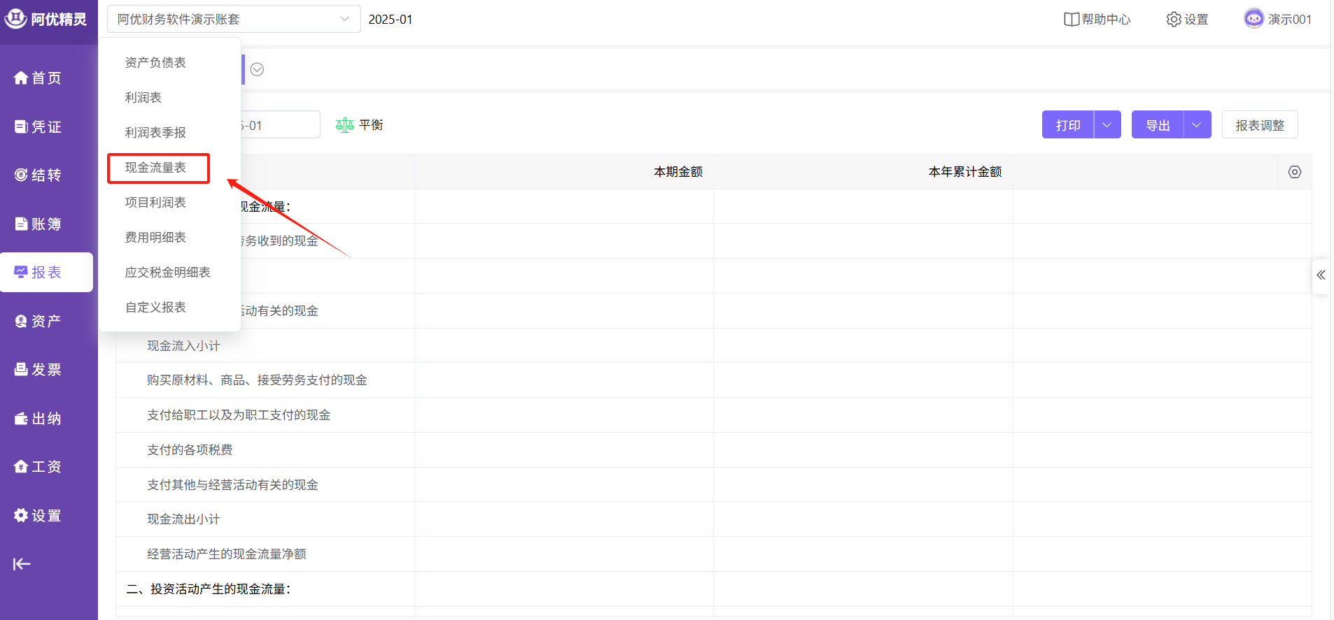 点击【报表】-【现金流量表】或【首页】-【现金流量表】进入页面。
