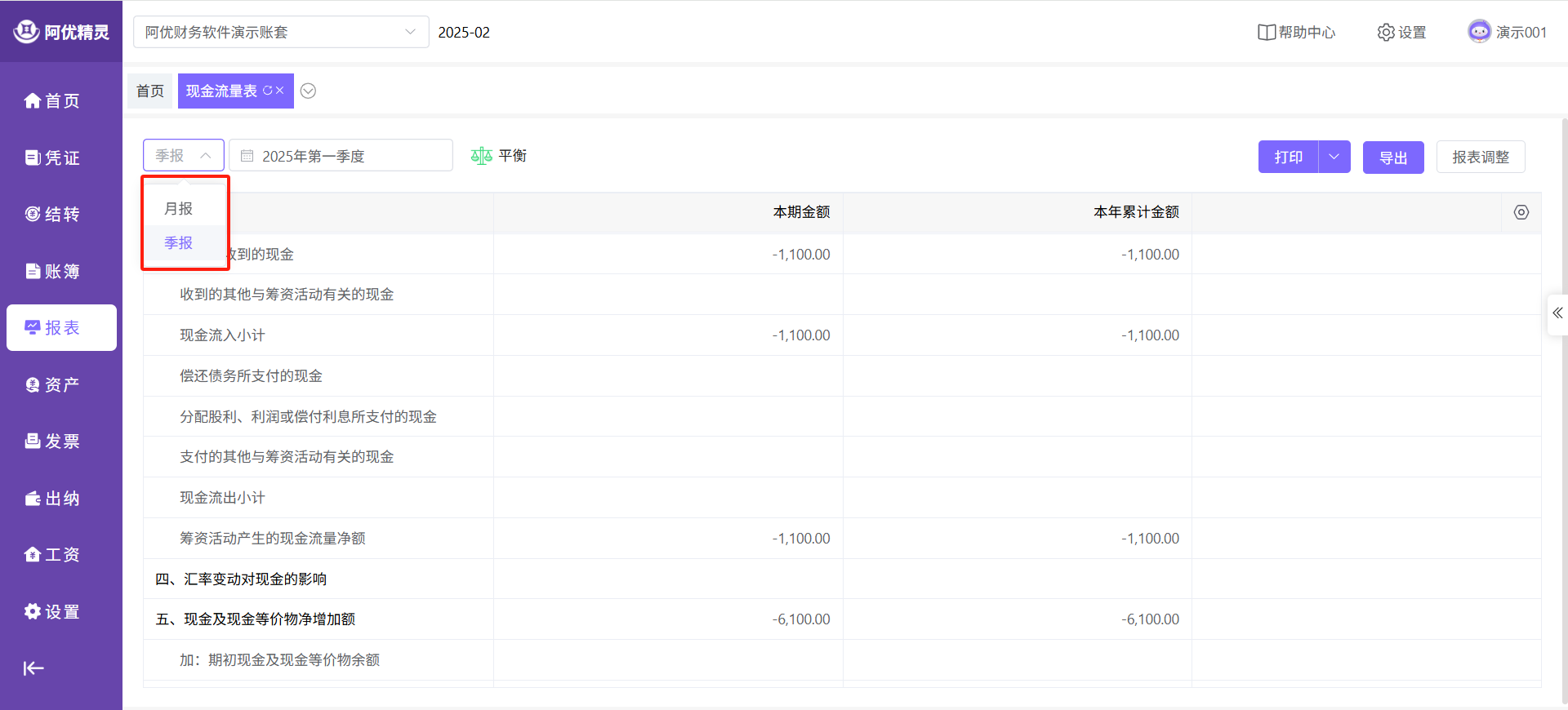 点击【报表】-【现金流量表】,可查看该报表,点击左上角的会计期间可以切换月份,可以按月查看,也可以切换为季度报表;