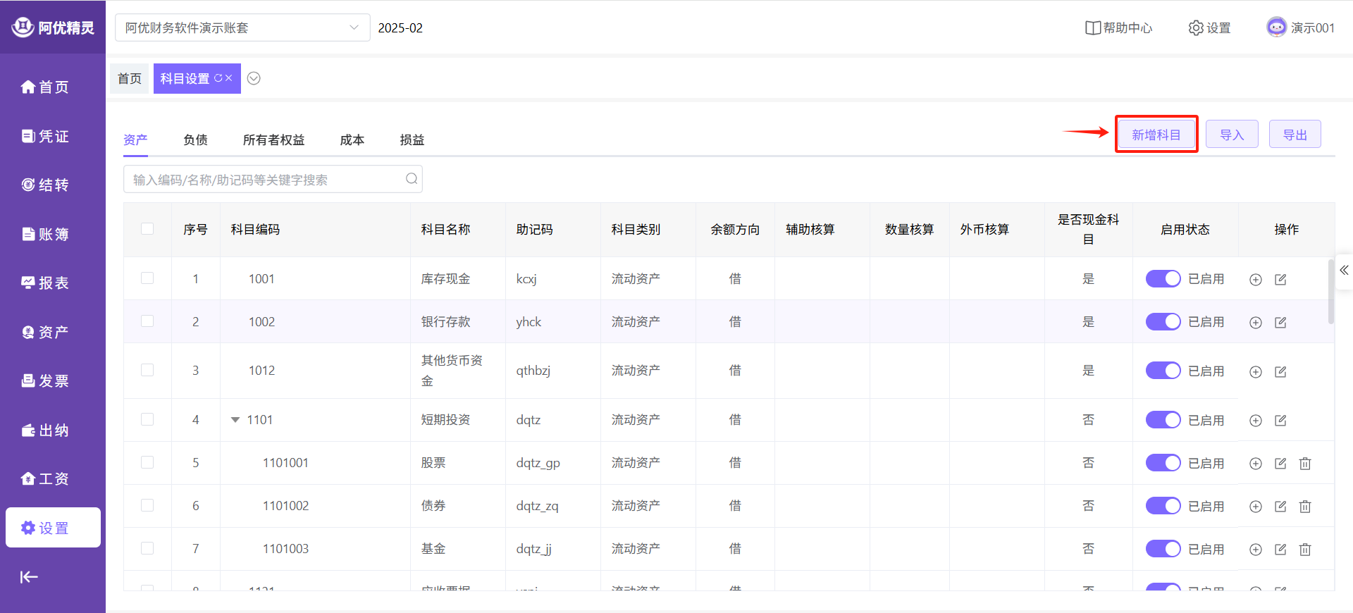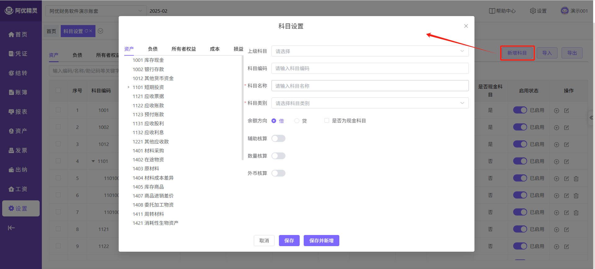 2、新增科目
