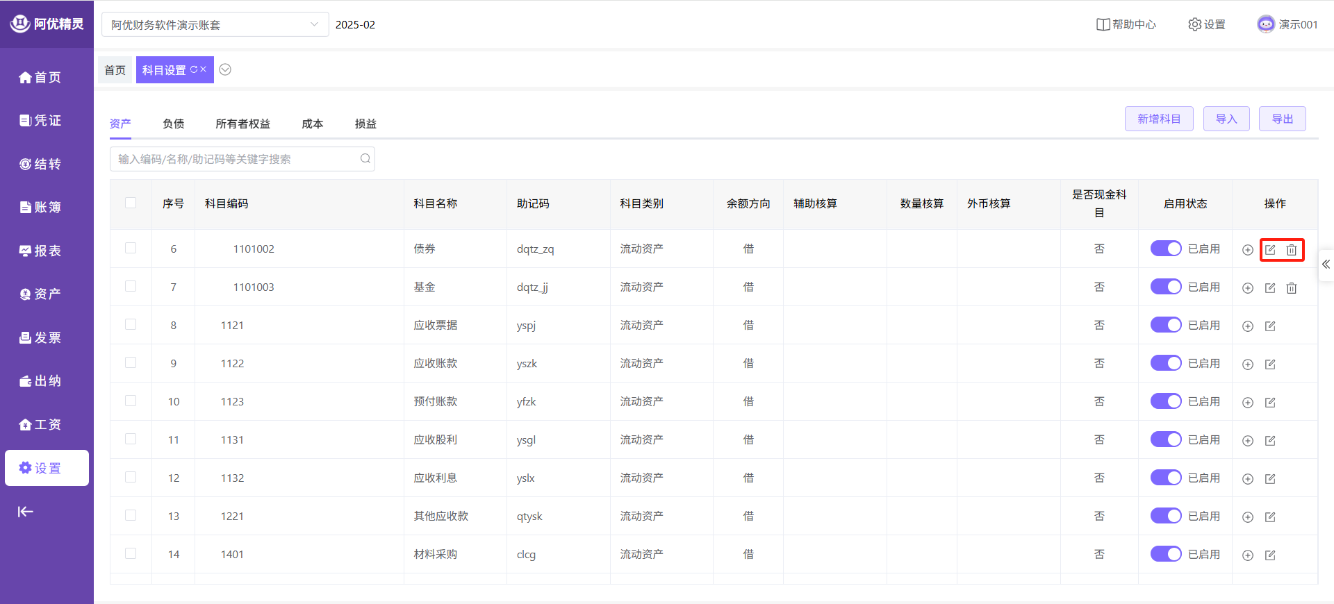系统默认一级科目不能删除,已使用科目不能删除