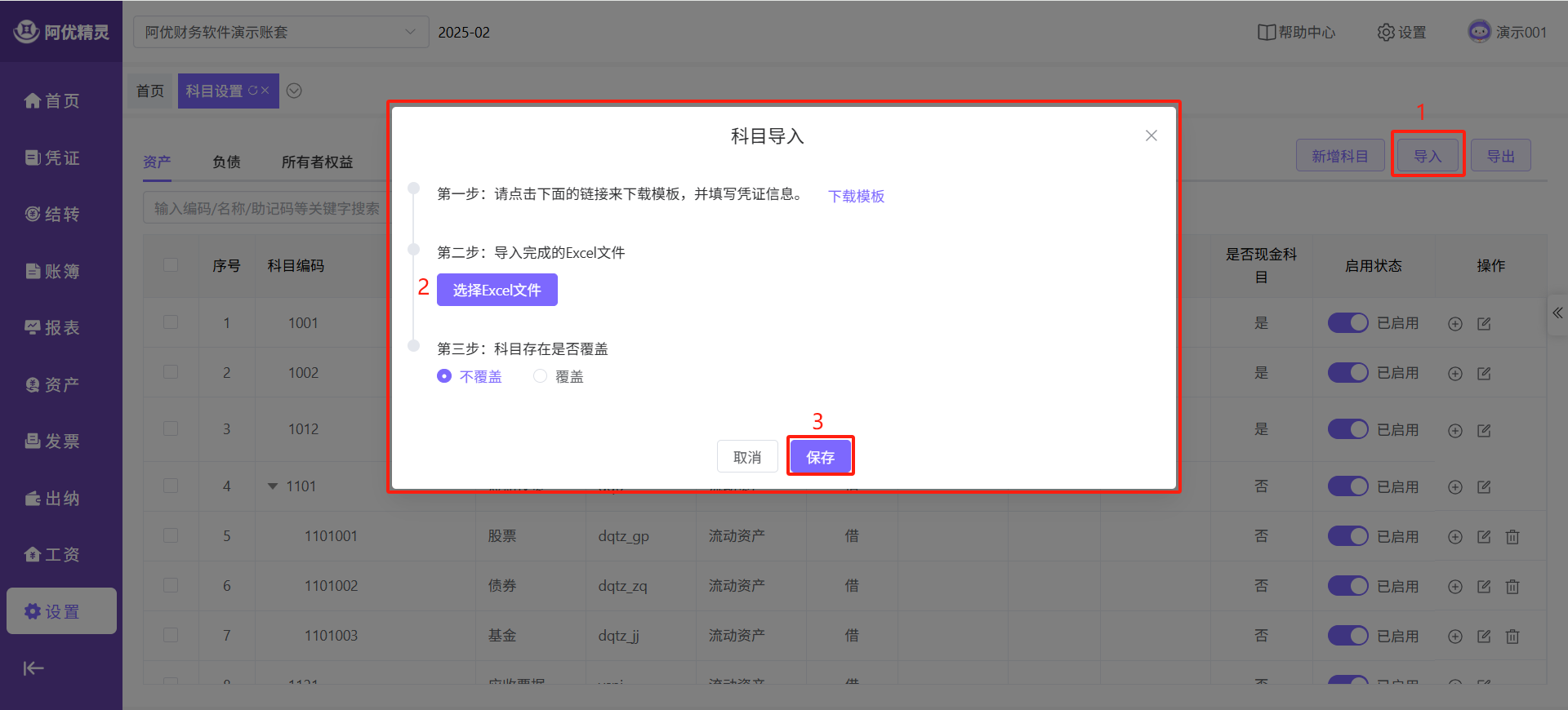 下载模版,填写数据,或者导出科目后修改