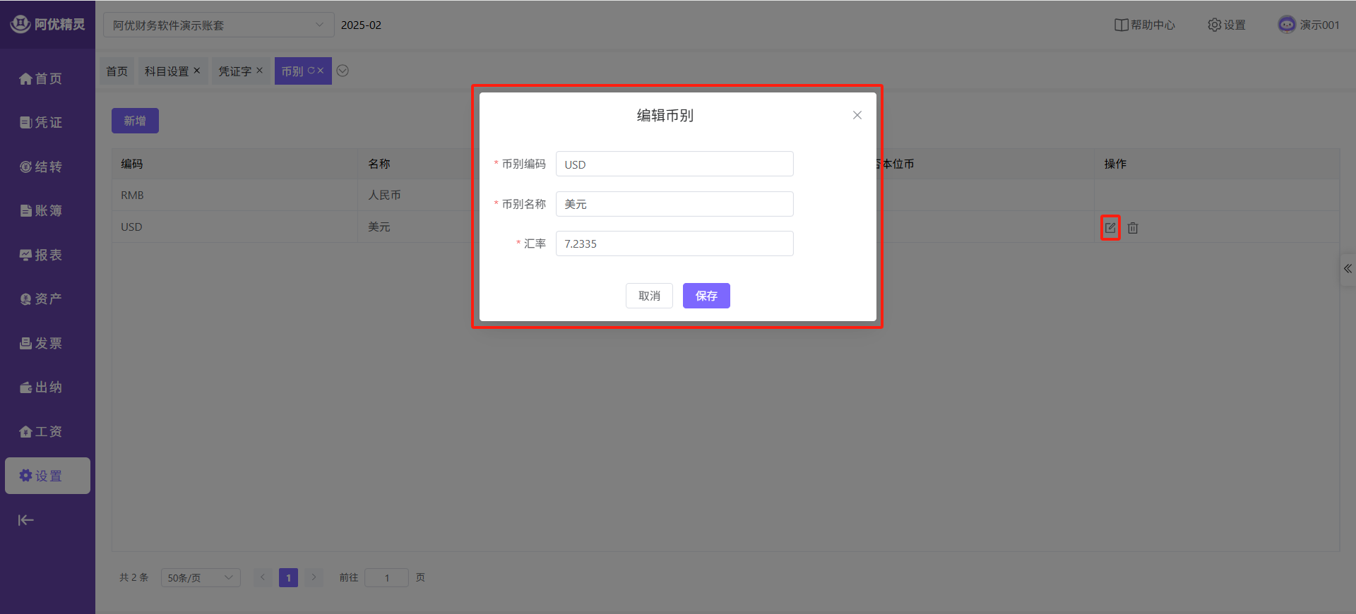 点击主菜单的【设置】-【币别】即可进入功能页面;