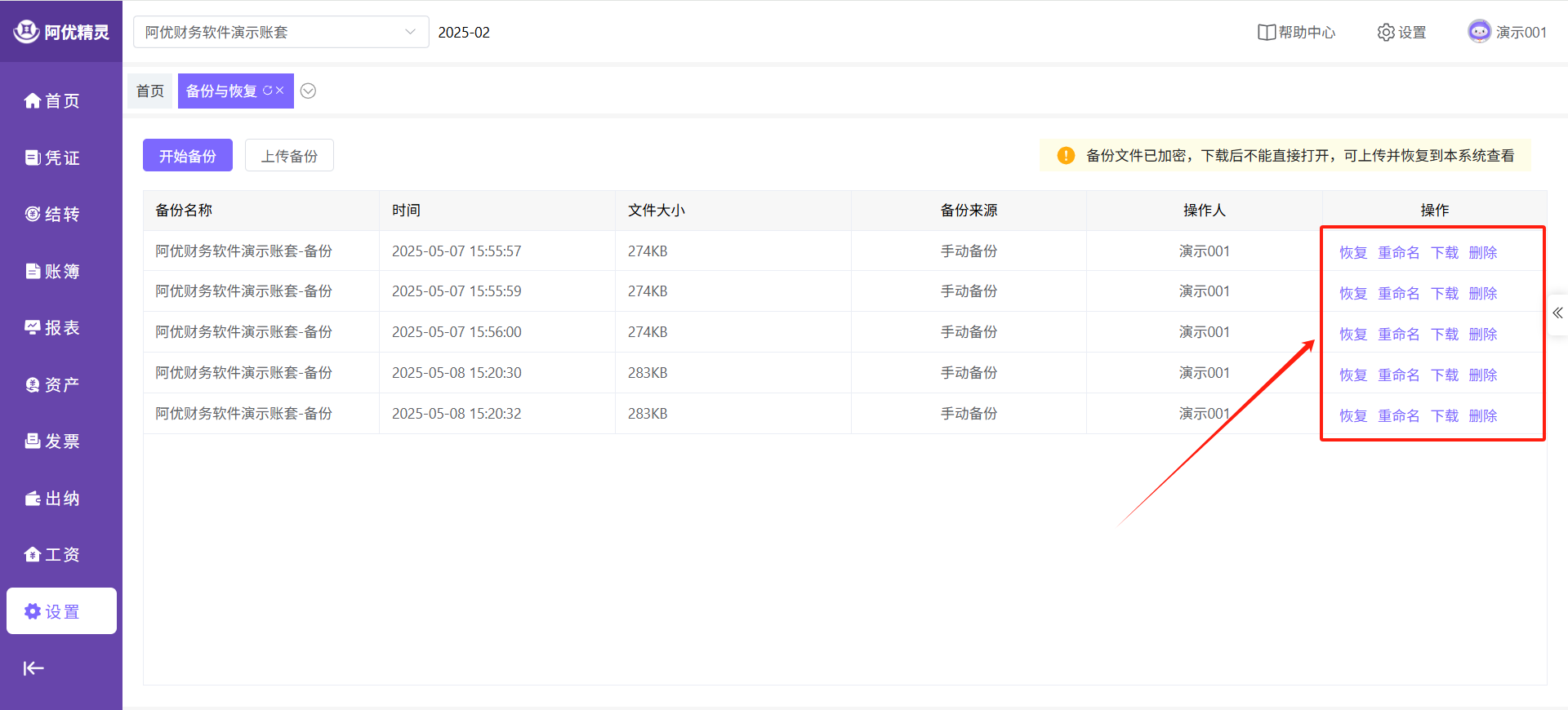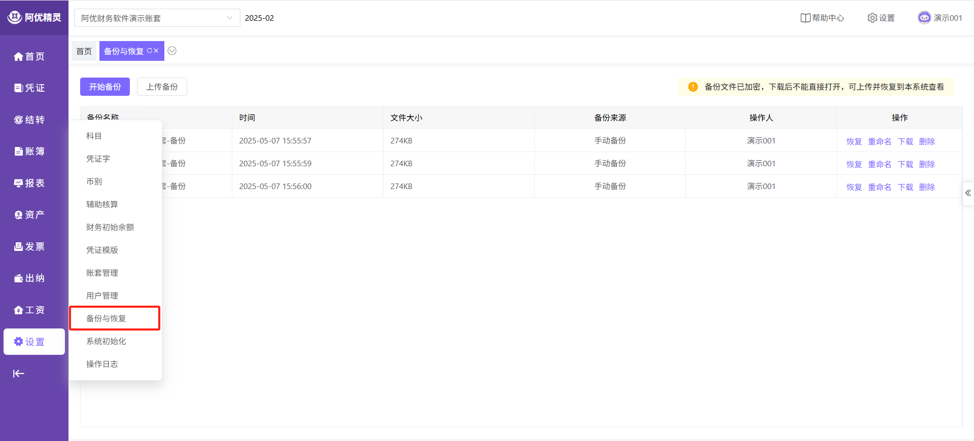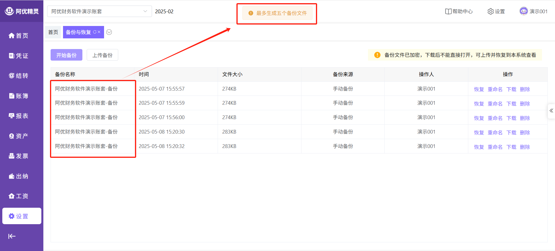 1、开始备份,系统将当前账套数据做一个备份,生成后在列表可以查看,账套最多有5个备份存在;