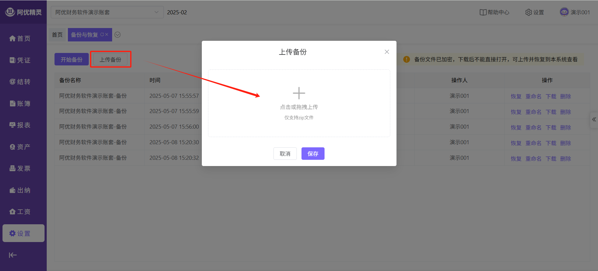 2、上传备份,可以将下载的备份进行上传,上传完成之后点击保存按钮;