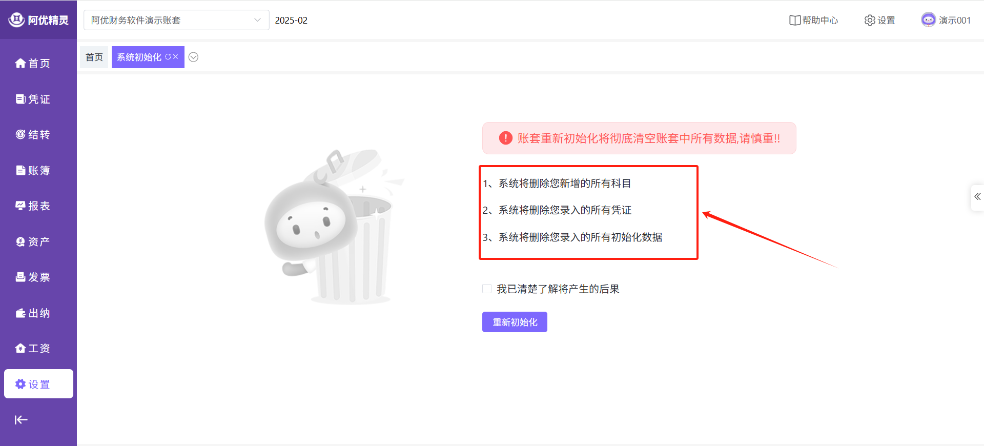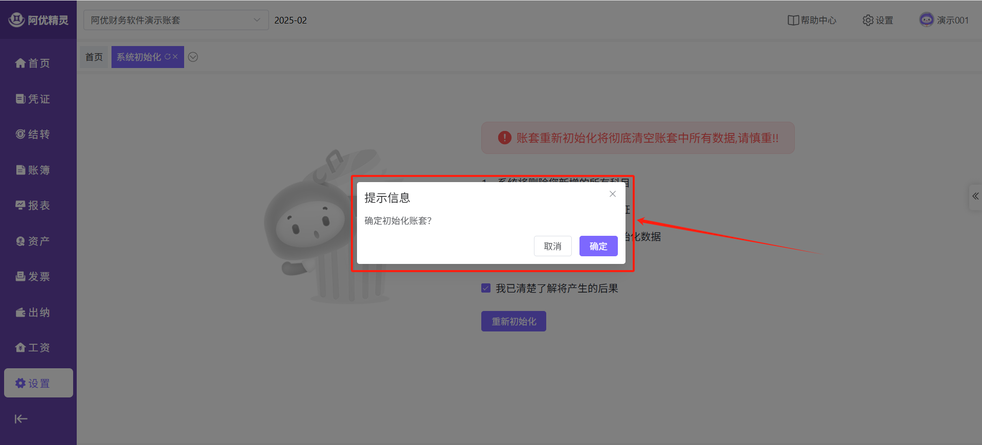 重新初始化系统,将会清空当前账套录入的所有数据,请用户慎重操作!