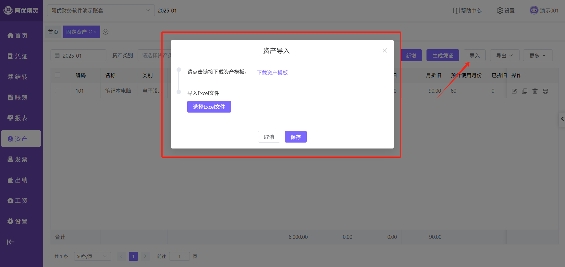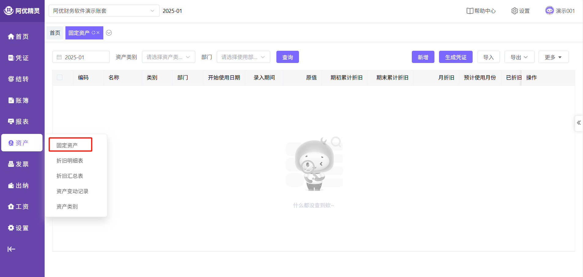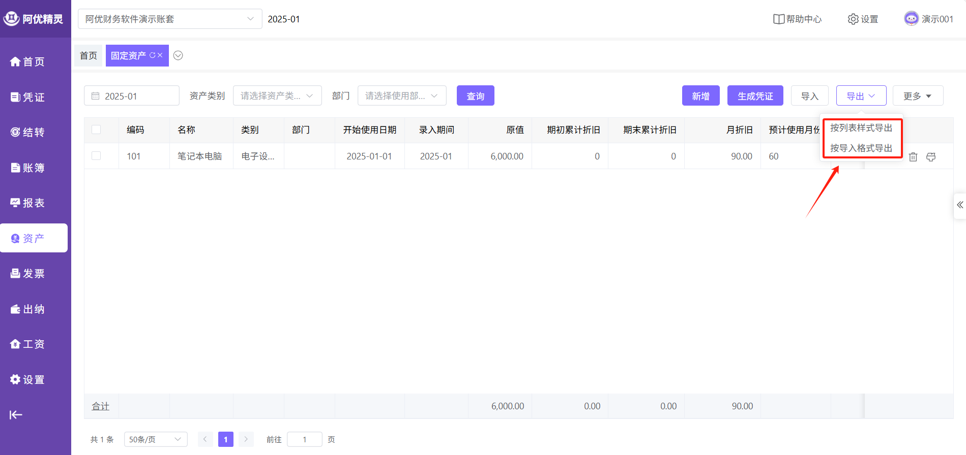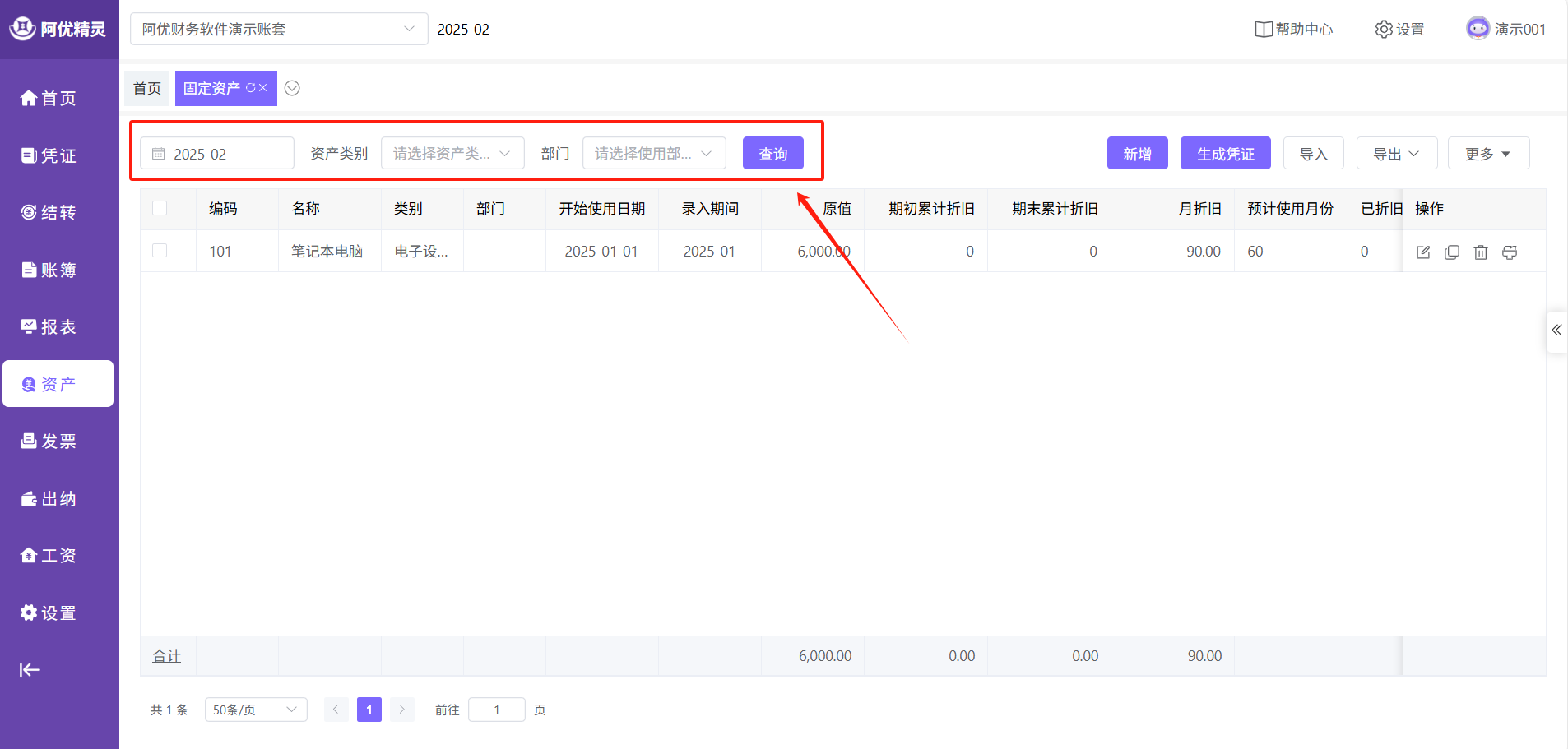 点击主菜单的【资产】-【固定资产】即可进入功能页面。
