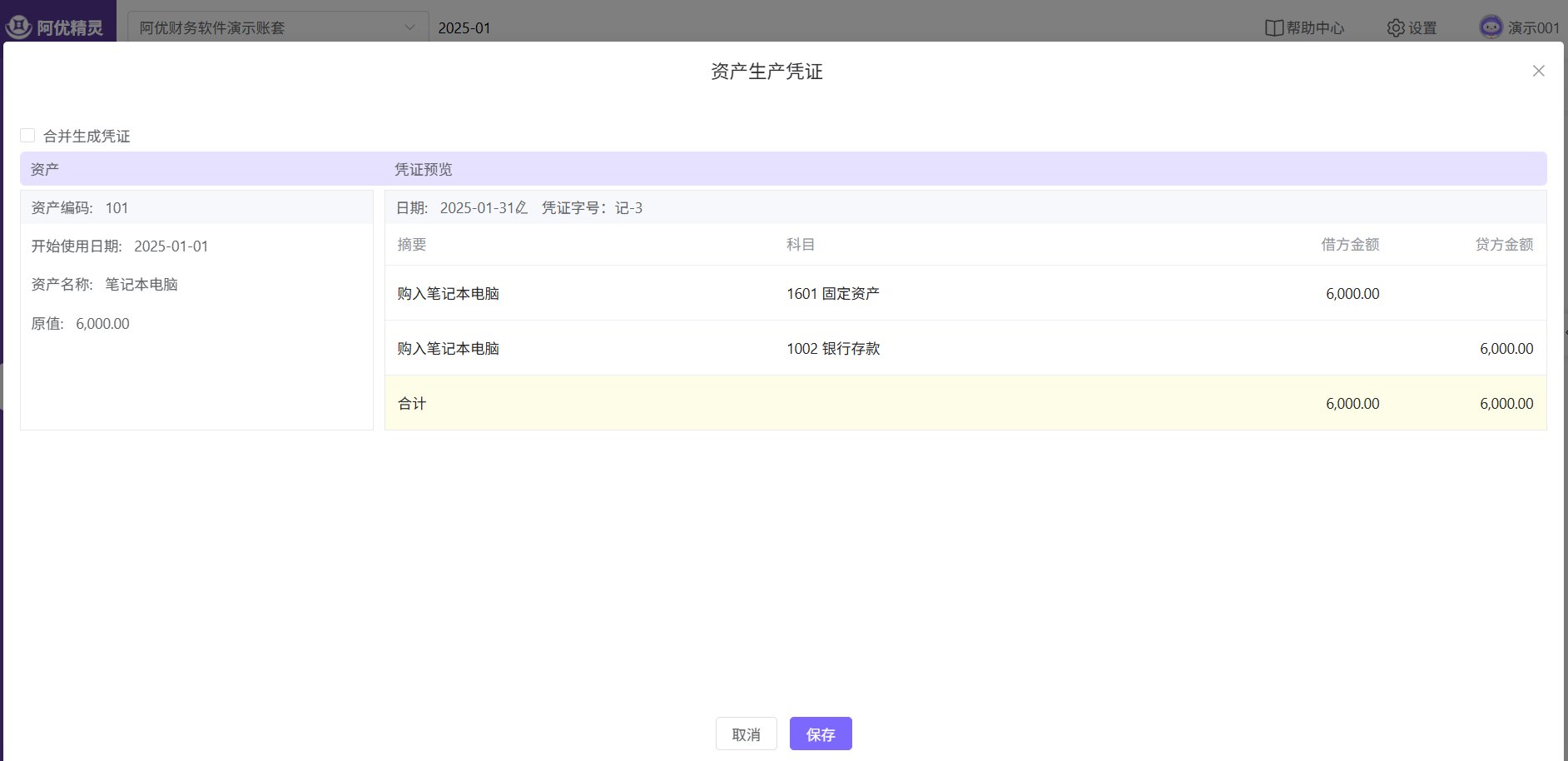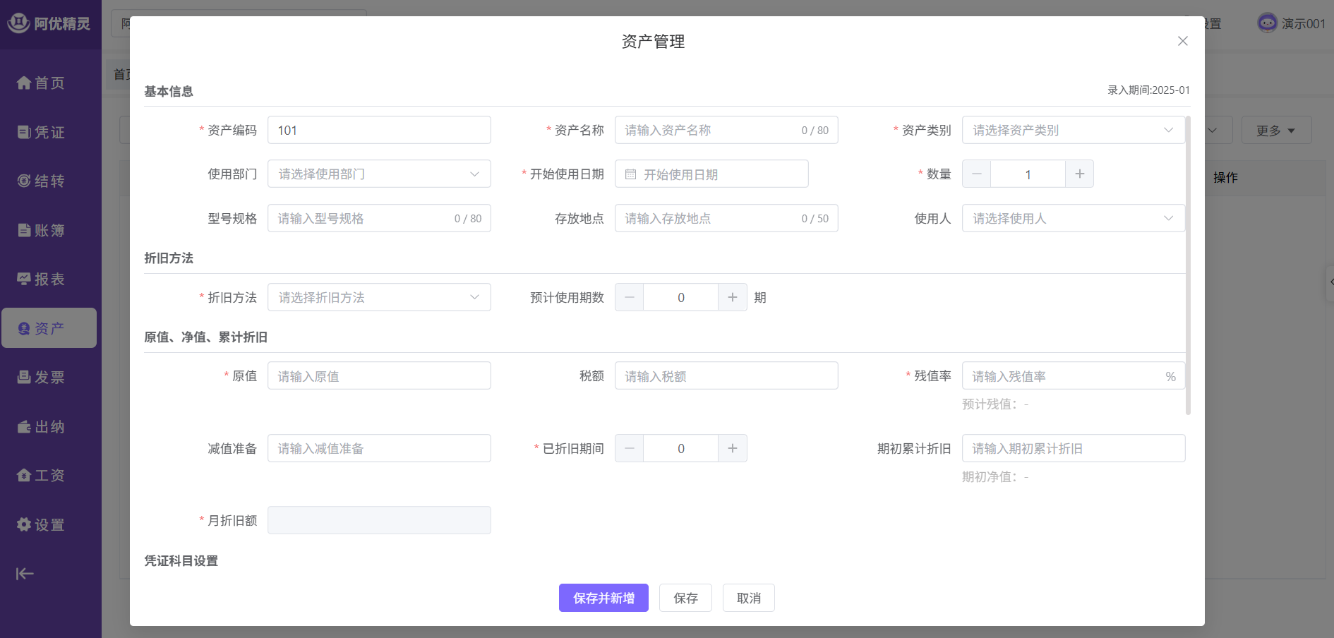 - 类别必选,在选择处可新增,选择后带出折旧方法、预计使用期数、固定资产科目、累计折旧科目