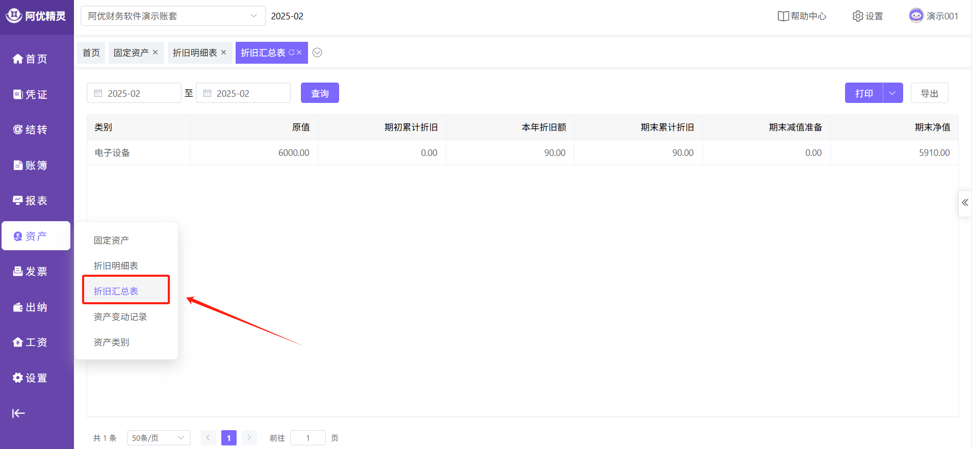 点击主菜单的【资产】-【折旧汇总表】即可进入功能页面。