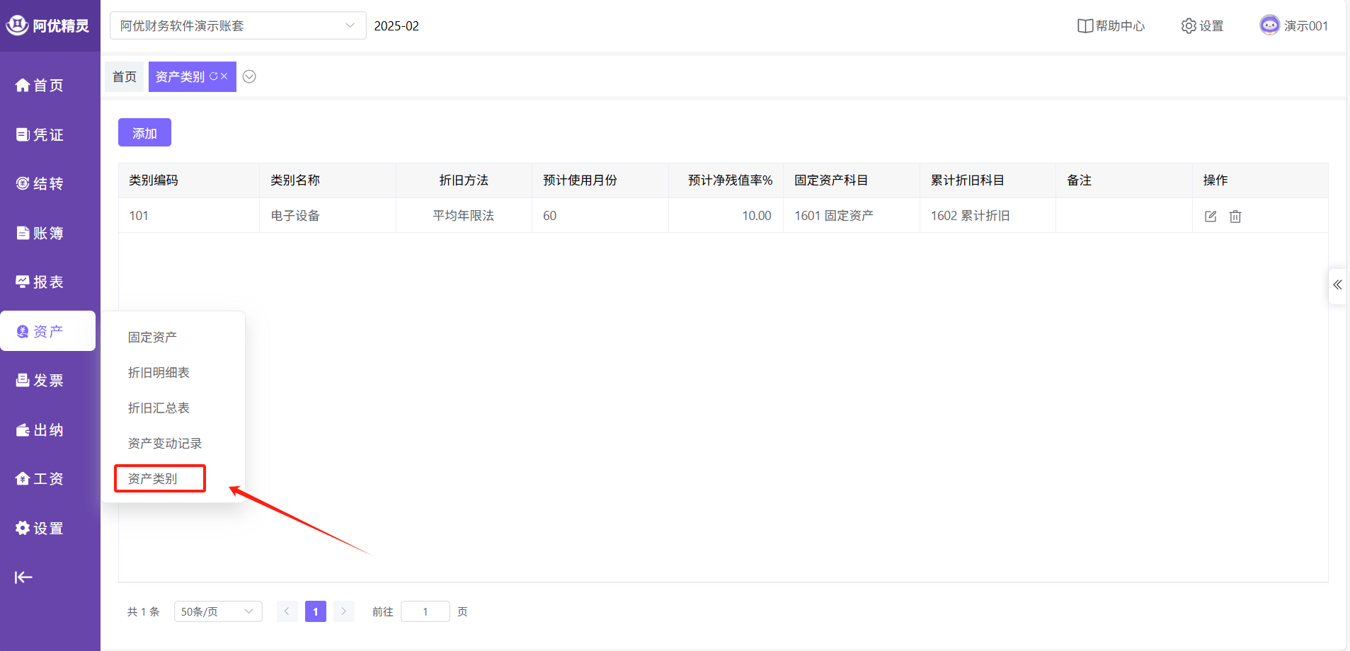 点击主菜单的【资产】-【资产类别】即可进入功能页面。