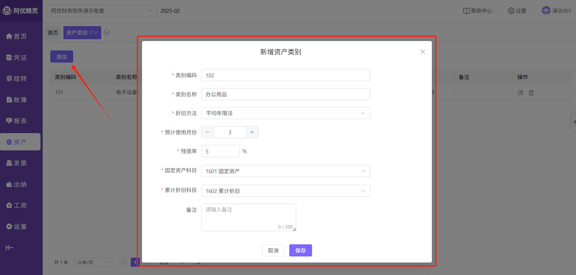 新增资产类别,点击资产类别页面的【添加】,可自定义新增资产类别