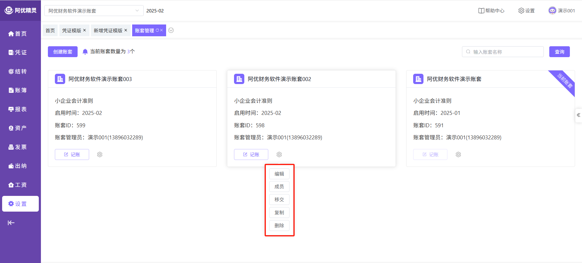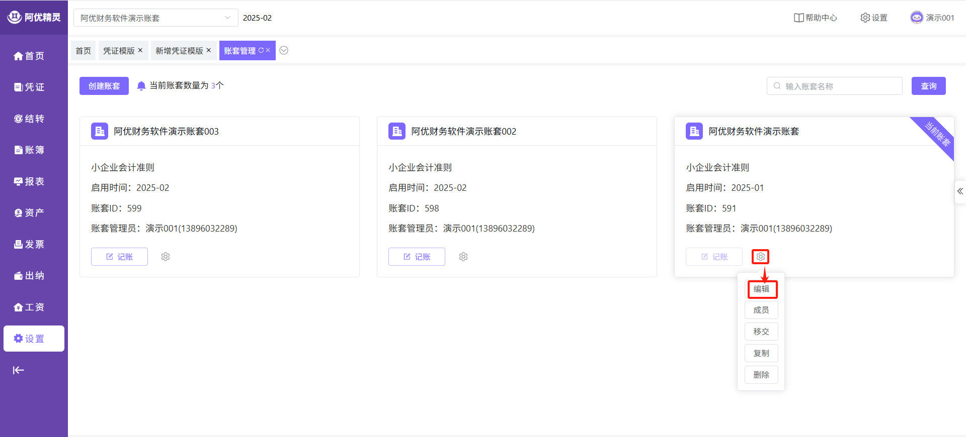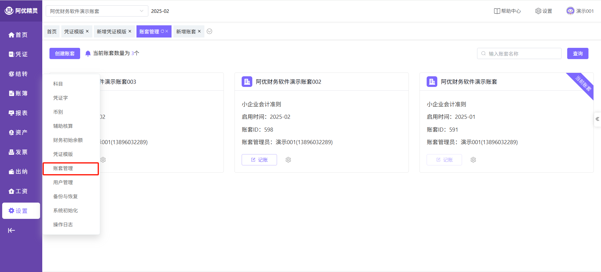 点击主菜单的【设置】-【账套管理】即可进入功能页面。