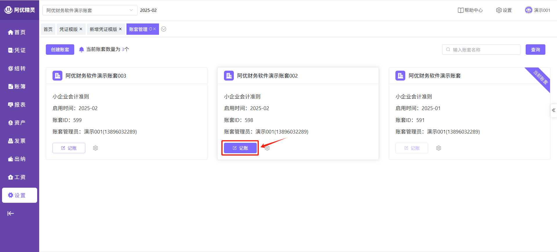 5、记账就是切换到该账套,跟顶部导航的账套切换功能一致。