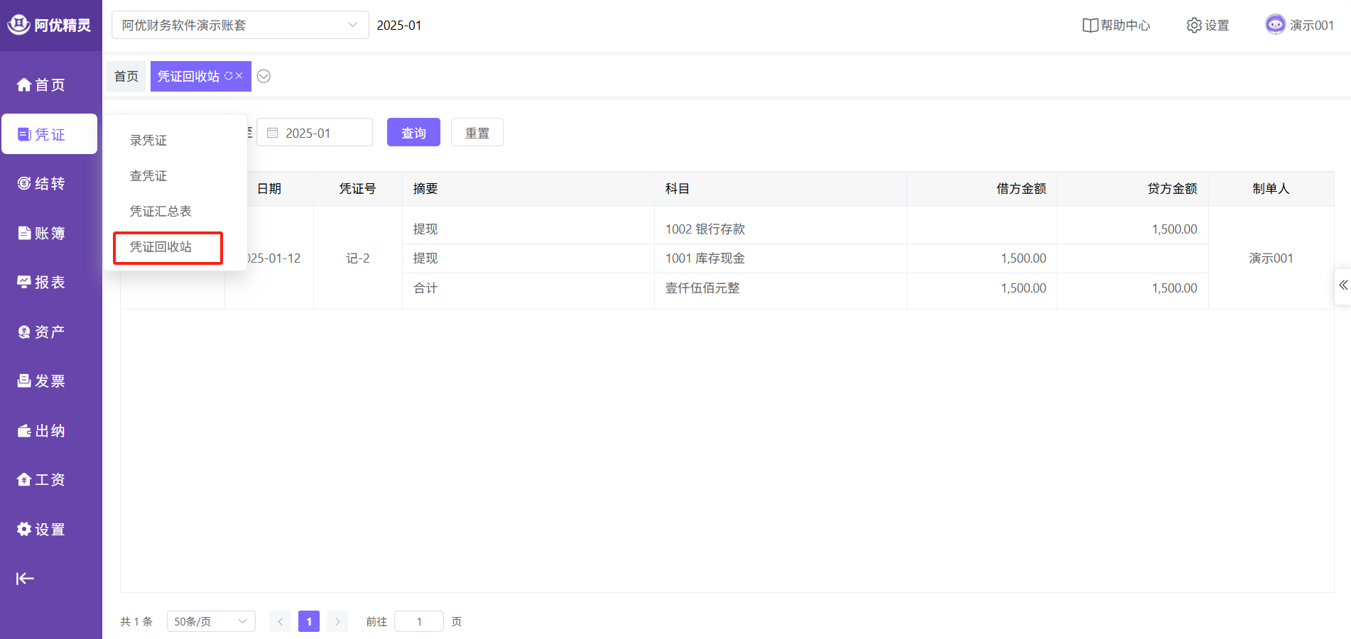点击主菜单的【凭证】-【凭证回收站】即可进入功能页面。