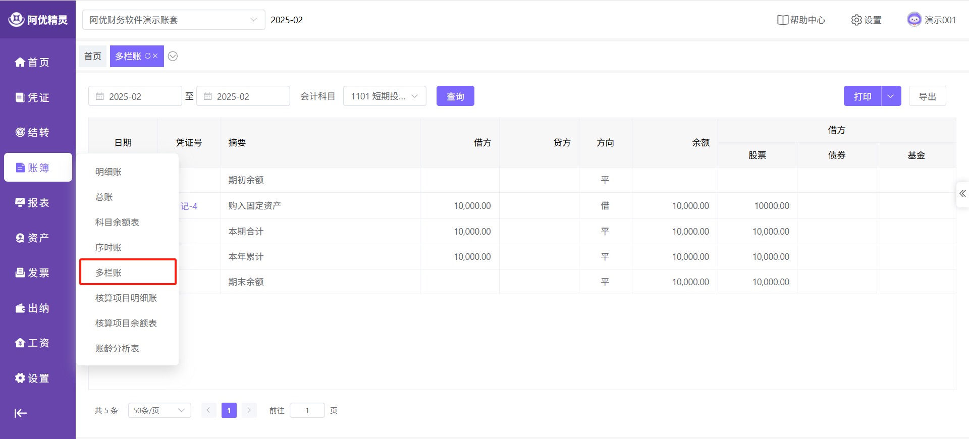 多栏账默认不查询,需要选择科目后查询(科目必须有下级科目或有辅助核算)