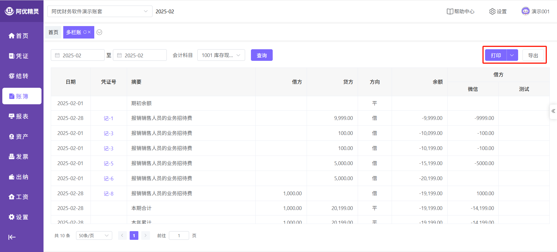 ①点击相应账簿右上角【打印】/【导出】可直接打印/导出该账簿;