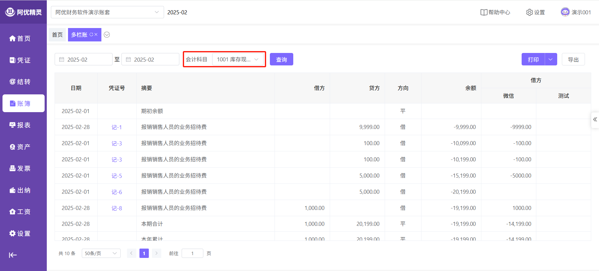 ①支持筛选会计期间,默认查看本月的数据(按日期、凭证字号、摘要、借贷方金额等数据);
