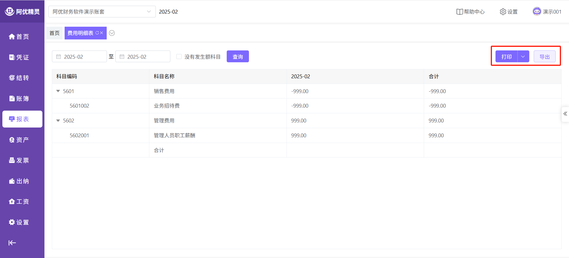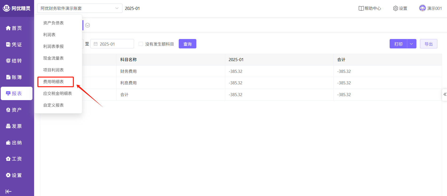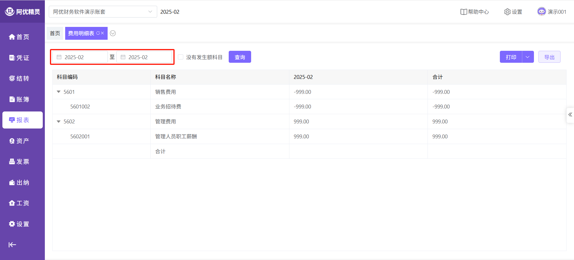 点击【报表】-【费用明细表】,即可查看该报表,支持自定义会计期间进行查看;