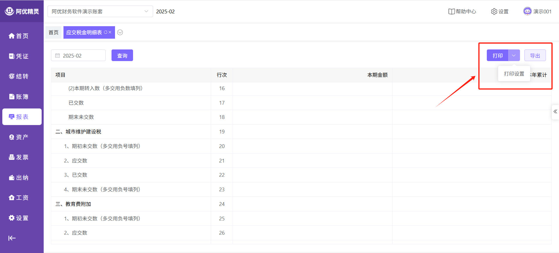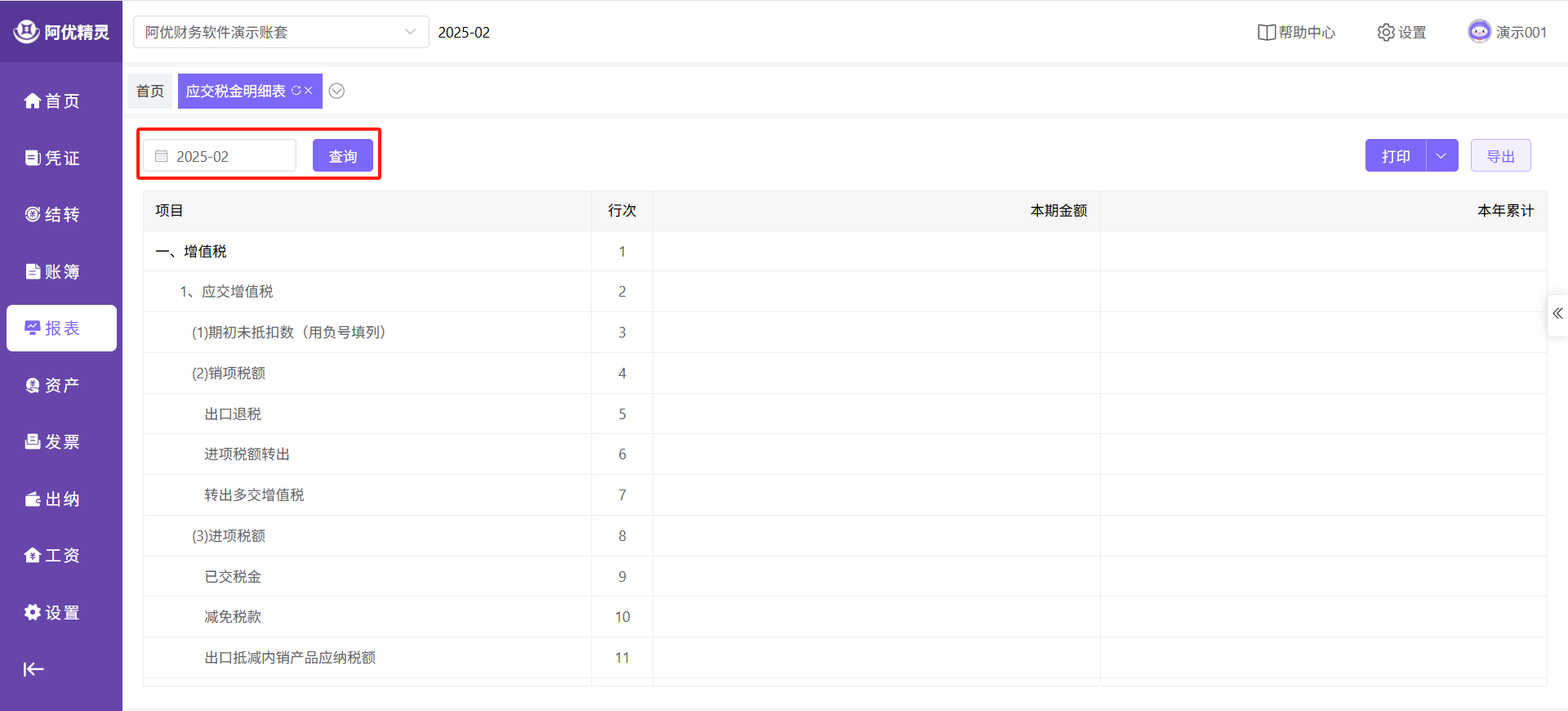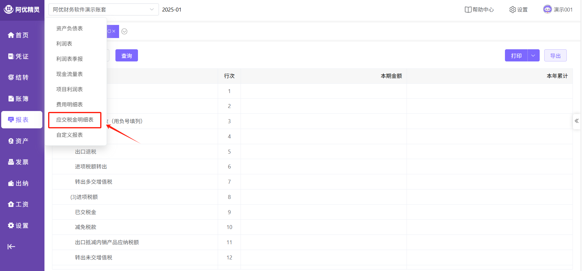 点击菜单栏【报表】-【应交税金明细表】进入页面。