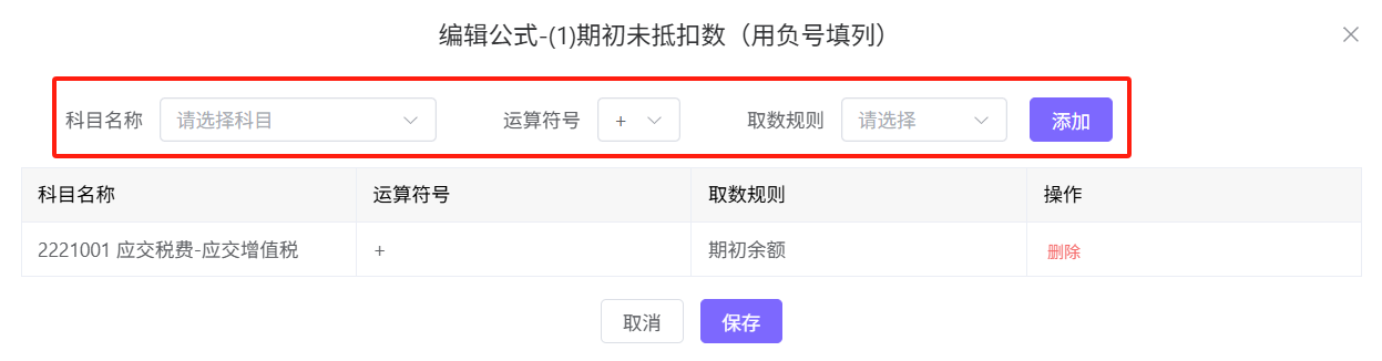 ②在【编辑公式】弹窗中,输入需要添加的科目名称、运算符号和取数规则,点击【添加】到报表公式中,然后点击【保存】按钮;