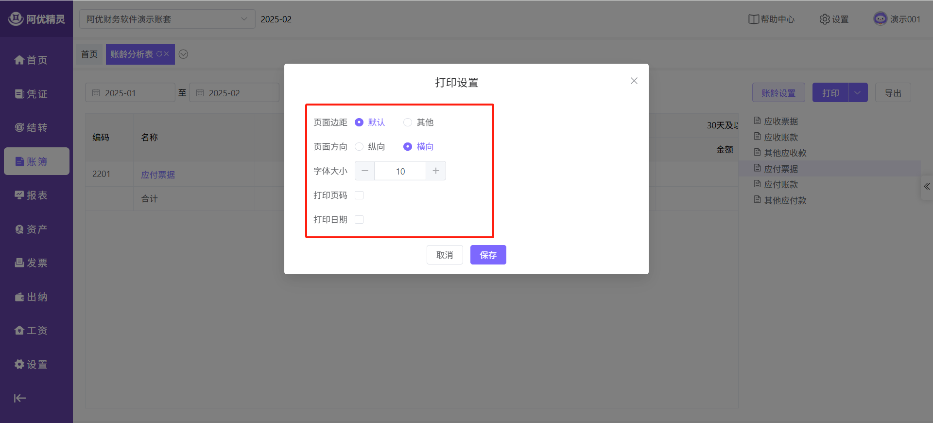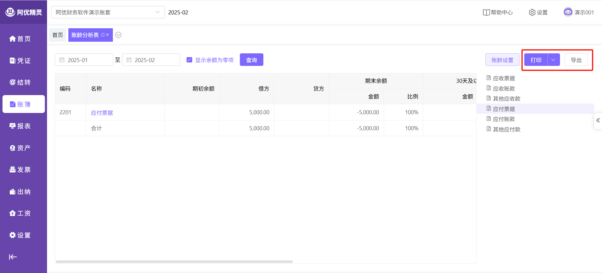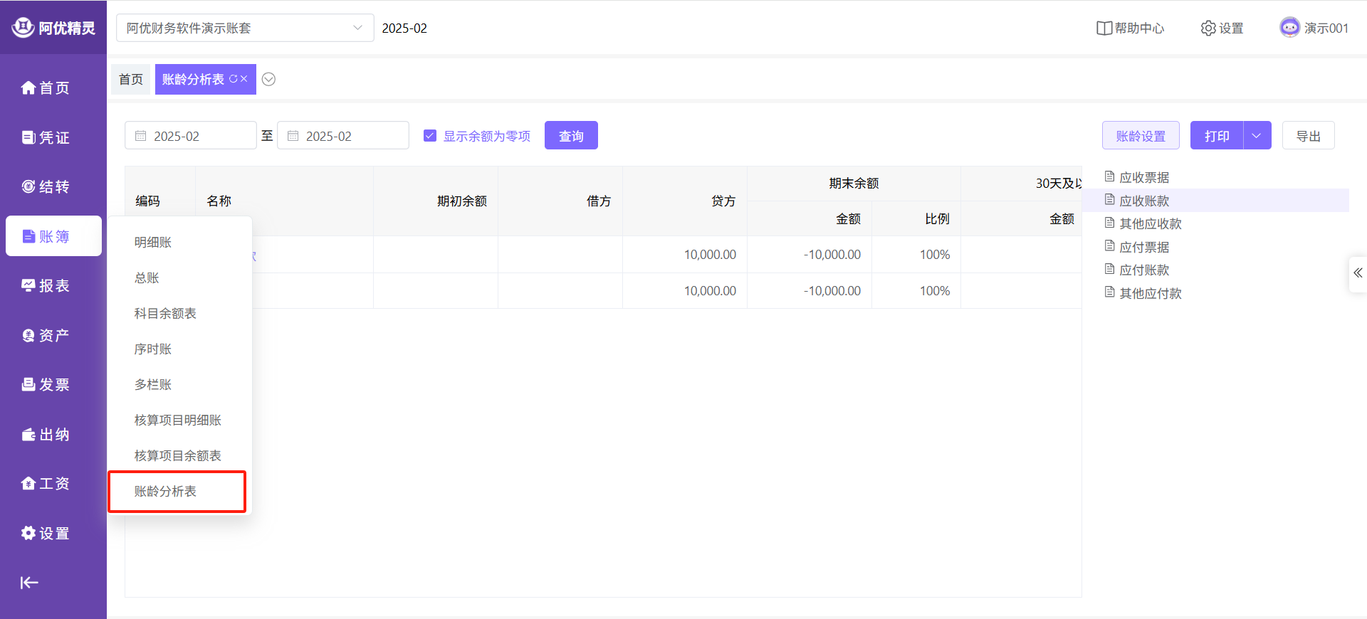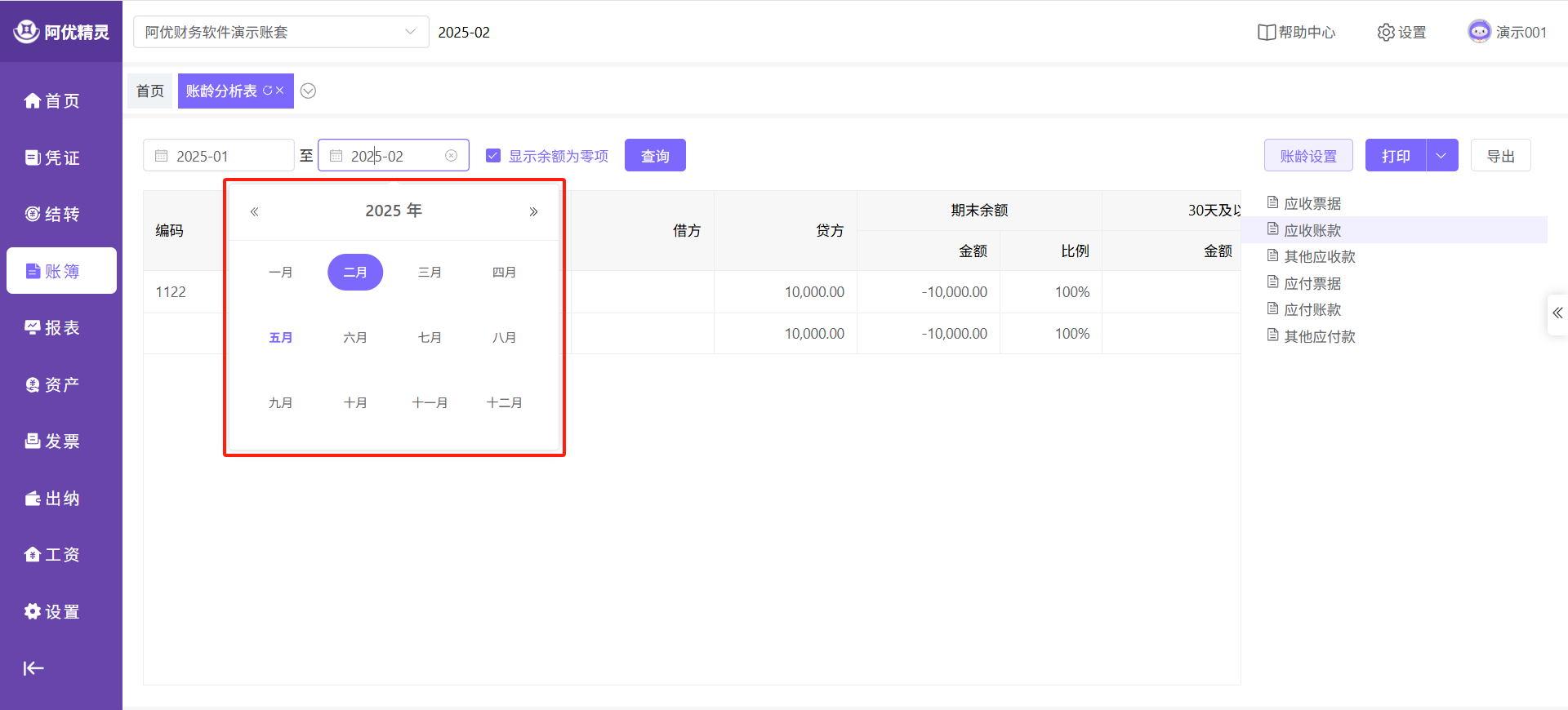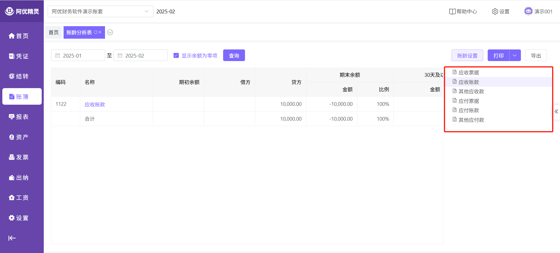 ①支持查看六大往来类科目的账龄分析表,点击右侧即可切换会计科目。