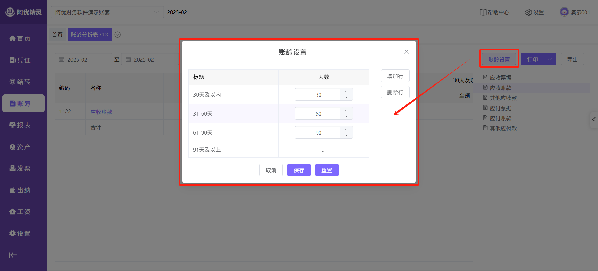 点击右上角【账龄设置】可进行操作,支持修改账龄天数,支持增加行和删除行。
