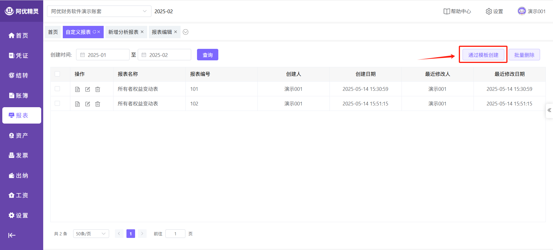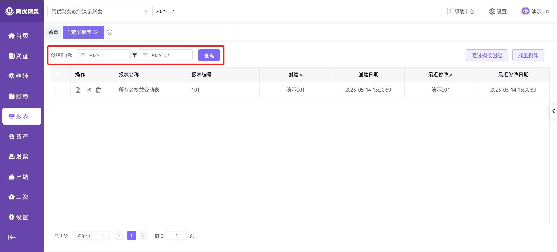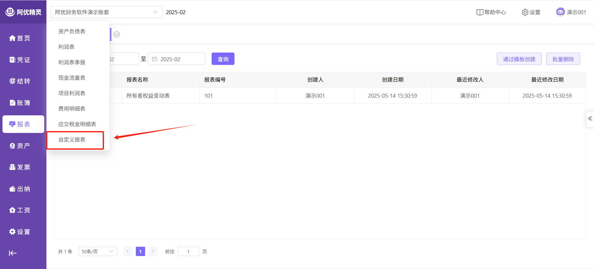 点击【报表】-【自定义报表】,即可查看该报表,支持自定义会计期间进行查看;