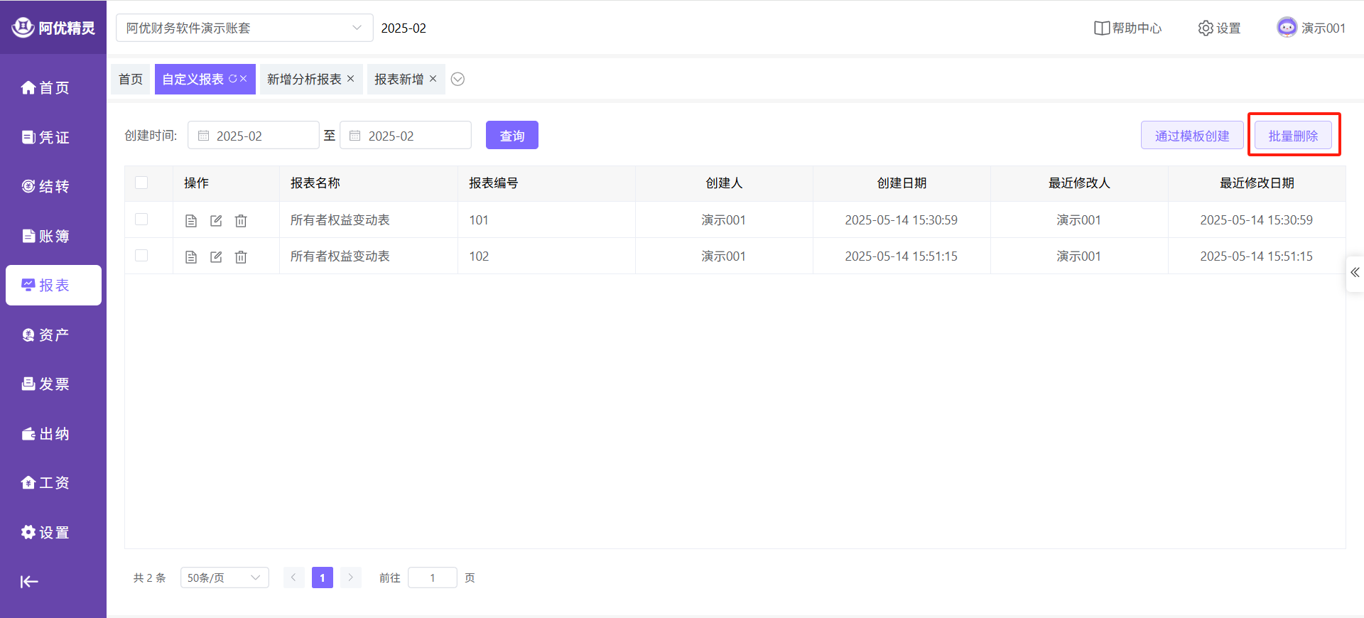 ①点击相应报表右上角【批量删除】可批量删除该报表;