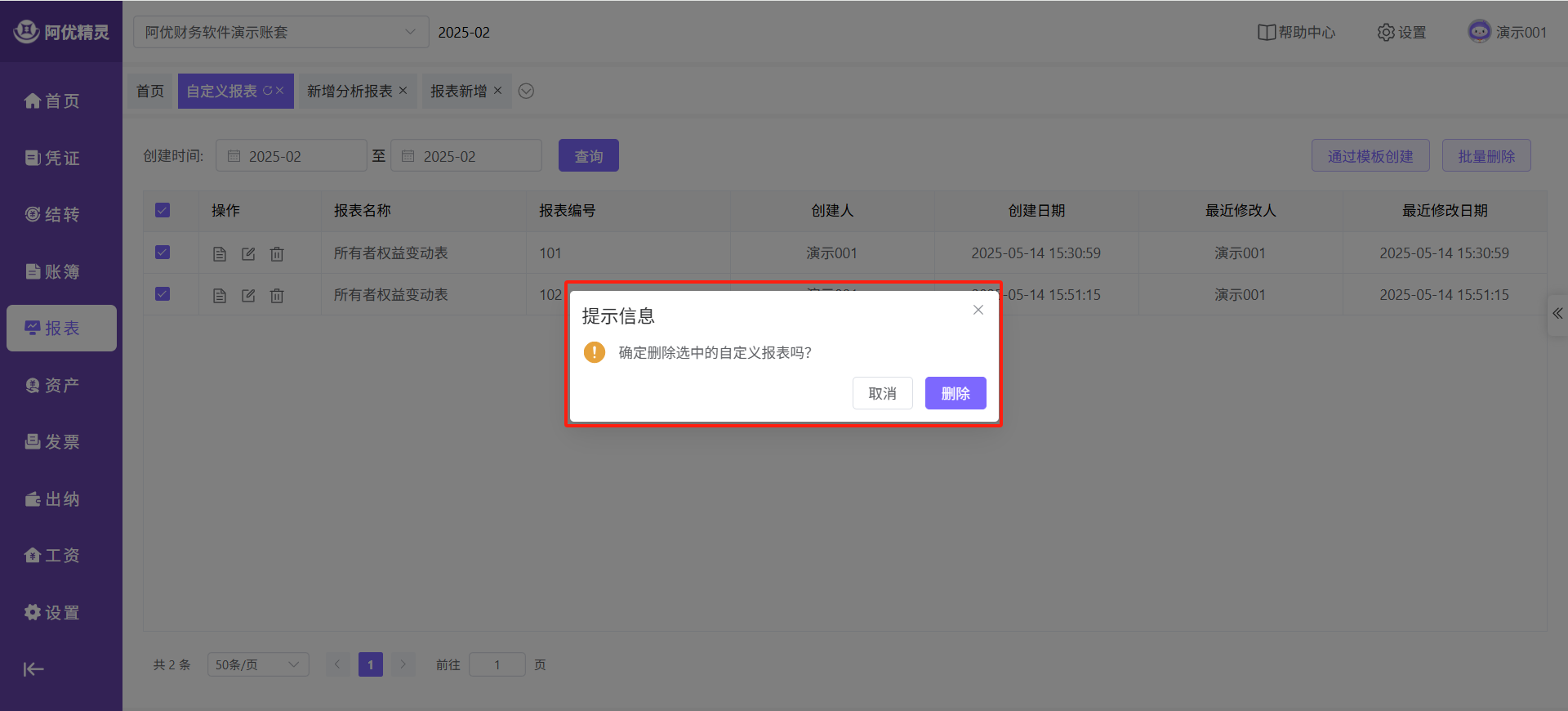 ②【批量删除】会弹出二次确认弹窗,确认无误后可点击【删除】按钮对自定义报表进行批量删除操作;