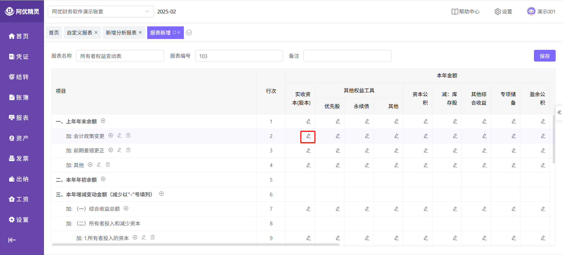 ③到报表新增页面,可以对每行单元格进行新增、编辑、删除等操作,编辑完成之后点击右上角【保存】按钮;