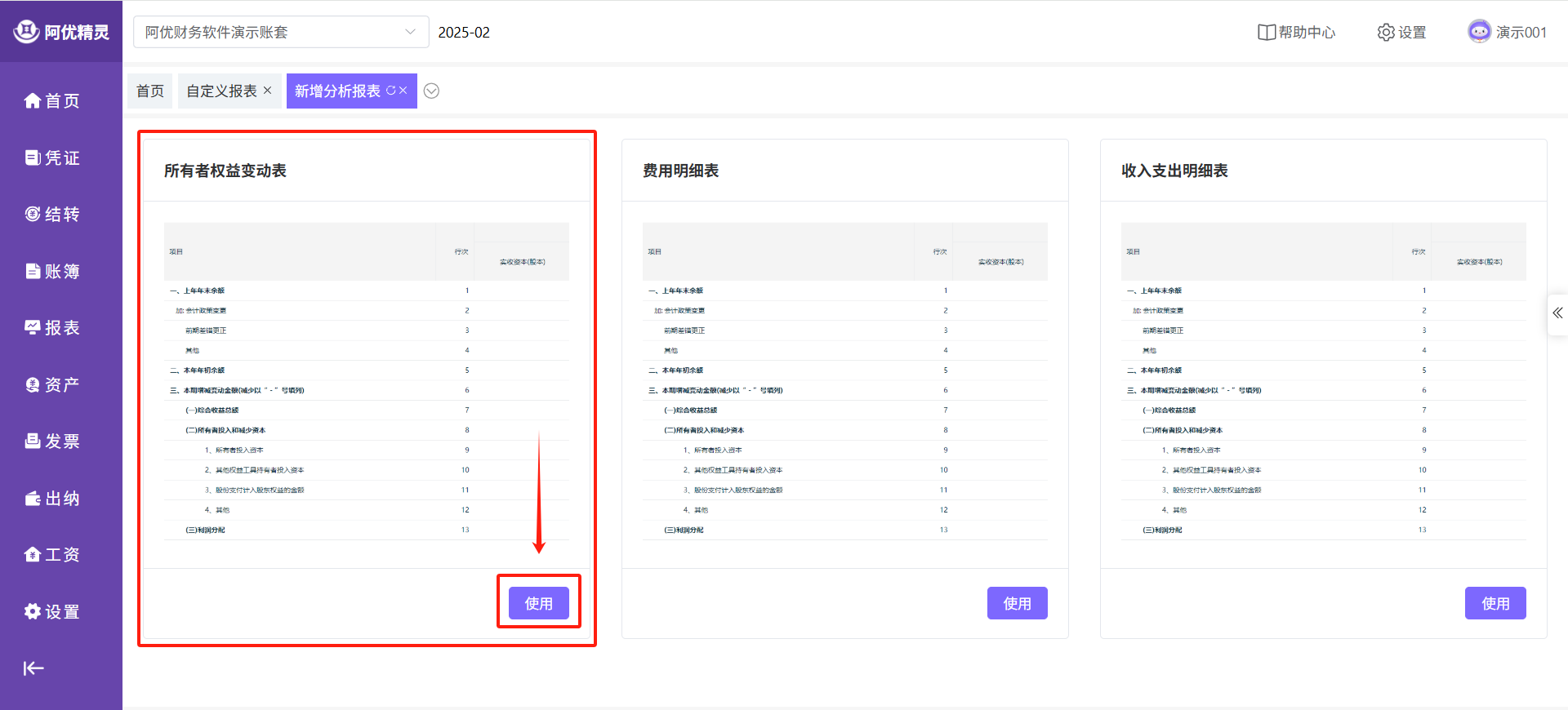 ②【新增分析报表】页面,选择需要的报表,点击【使用】按钮;